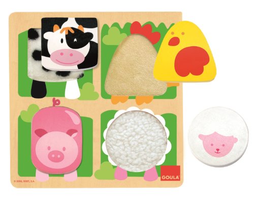 Goula - 53011 - Puzzle - Ferme / Etoffe - Sur une planchette en bois, quatre emplacements pour animaux de la ferme sont disponibles. Avant de placer la piè,ce correspondante l'enfant pourra par le toucher caresser une surface en tissu qui correspond à, l'animal. Que de douceur dans ce geste ! Dimensions : 22 x 22 x 2 cm Age : de 1 à, 2 ans Les jeux et jouets Goula sont aux normes de sé,curité, en vigueur et garantis par le label CE. , Tous les produits sont conç,us et fabriqué,s avec la plus
