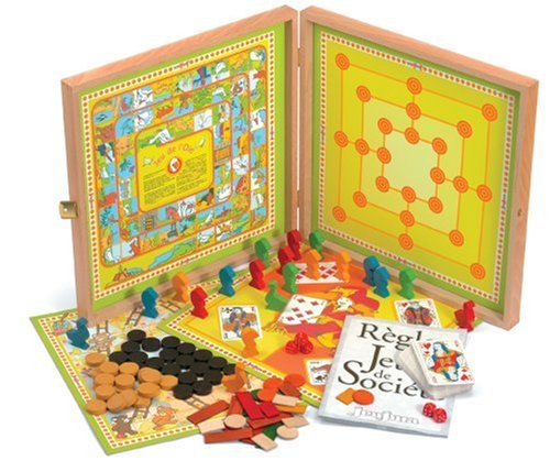 JeuJura - Jouet en bois - Coffret 80 règles - Pions Bois -  , Jouet en bois - Coffret 80 rè,gles - Pions Bois  , Descriptions du produit Coffret de jeux de socié,té, : Jeux des petits chevaux, oie, dames, marelle, nain jaune, é,chelle, yams, 421, jeu de cartes... 40 dames, 4 oies, 16 chevaux, 5 dé,s, jeu de 54 cartes Livret de 80 rè,gles de jeux Dimensions : 33 x 33 x 5 cm A partir de 3 ans Fabrication Franç,aise !  ,