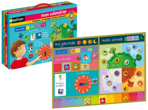 Nathan - 31043 - Jeu éducatif - Grand Format l'heure et le Temps - Un tableau magnétique à suspendre dans la chambre pour découvrir l'heure, le temps et les saisons A gauche, l'enfant affiche sa journée: le jour, le mois, les activités de la journée, le temps qu'il fait.Il y a même une horloge. A droite, l'enfant joue à illustrer la saison.En bas, les 12 mois de l'année pour afficher tous les évènements importants: Noël, fête des mère...