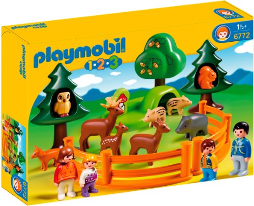 La famille PLAYMOBIL 1.2.3 part visiter le parc d'animaux ! Quatre personnages avec neuf animaux (biches, cerf, cochon, écureuil…). Certains animaux peuvent se glisser dans les arbres (jeu de formes).