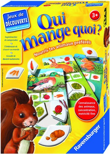 Ravensburger - 24255 - Jeu Educatif - Qui mange quoi ? - Où vit le chevreuil ? Que mange l'écureuil ? Un jeu pour mieux connaître et découvrir les animaux. Le jeu consiste à compléter les planches animaux avec les bons aliments. L'enfant repère les jetons correspondant aux images de chaque planche, il apprend le nom des aliments et découvre ce que mange chaque animal.Ce jeu lui permet d'avoir une première approche documentaire de la vie d'animaux familiers et d'enrichir son vocabulaire.Ce jeu est recommandé en maternelle. Contenu : 8 cartes