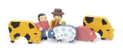 JeuJura - 8086 - Jouet en bois - construction - Fermiers et Animaux - 2 personnages en bois articulés (jambes et bras) de 6cm de haut + 2 vaches, 1 cochon et 1 mouton en bois peint. Accessoires incontournables des chalets et maisons JeuJura pour créer de la vie et des histoires dans ces maisons en bois.A noter : les personnages peuvent différer (couleur) du visuel en fonction des arrivages